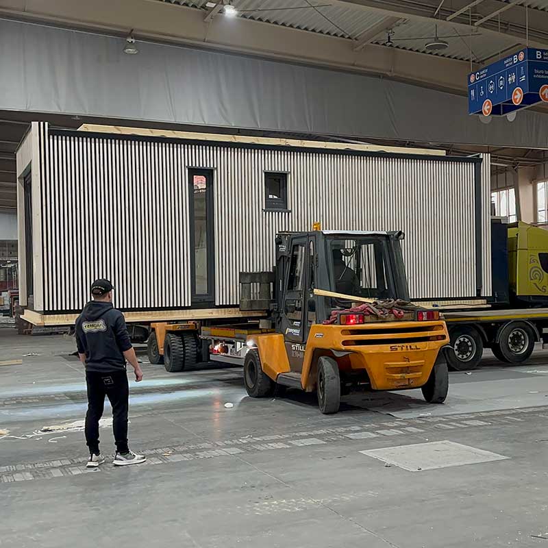 Minimalistyczny dom stawiany w całości we wskazane przez Ciebie miejsce, bez pozwolenia na budowę. Może pełnić zarówno rolę domku dla gości, jak i nowoczesnego biura.