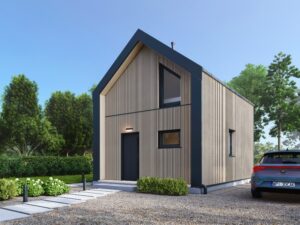 Projekt domu modułowego DH44, to kompaktowy dom o powierzchni użytkowej 39,12 m², który został zaprojektowany w taki sposób, aby maksymalnie wykorzystać dostępną przestrzeń, zapewniając jednocześnie komfort codziennego życia. Dopasowany do specyficznych wymagań inwestora, DH44 łączy w sobie estetykę z ergonomią, co sprawia, że każdy centymetr przestrzeni jest optymalnie wykorzystany.