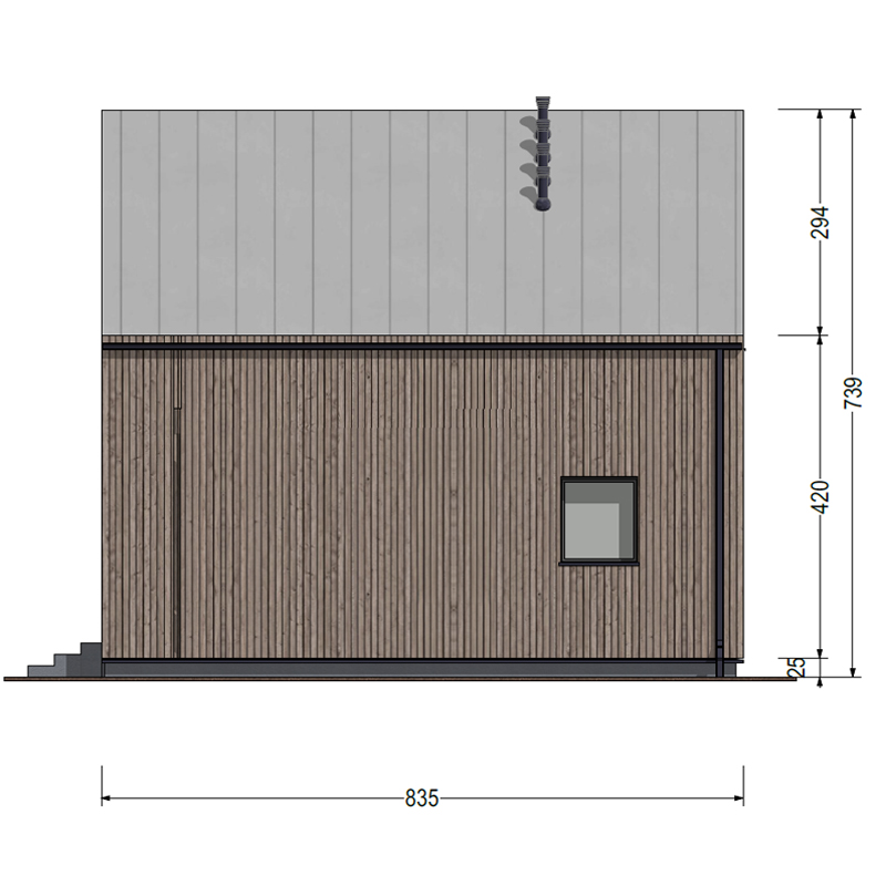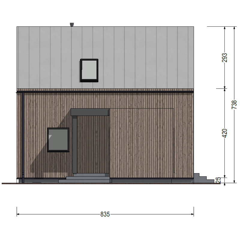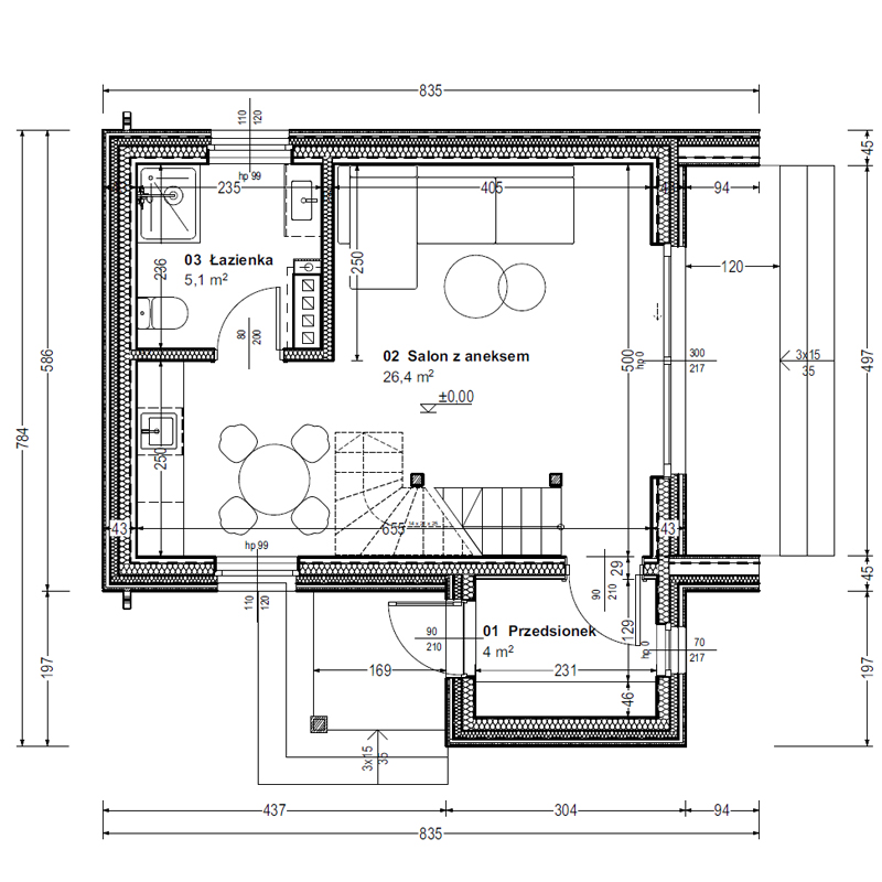Na parterze (35,62 m²) znajduje się przestronny salon z aneksem kuchennym (26,44 m²), funkcjonalna łazienka (5,13 m²) oraz przedsionek (4,05 m²). Duże przeszklenia w części dziennej doświetlają wnętrze i wizualnie powiększają przestrzeń, sprzyjając kontaktowi z otoczeniem.